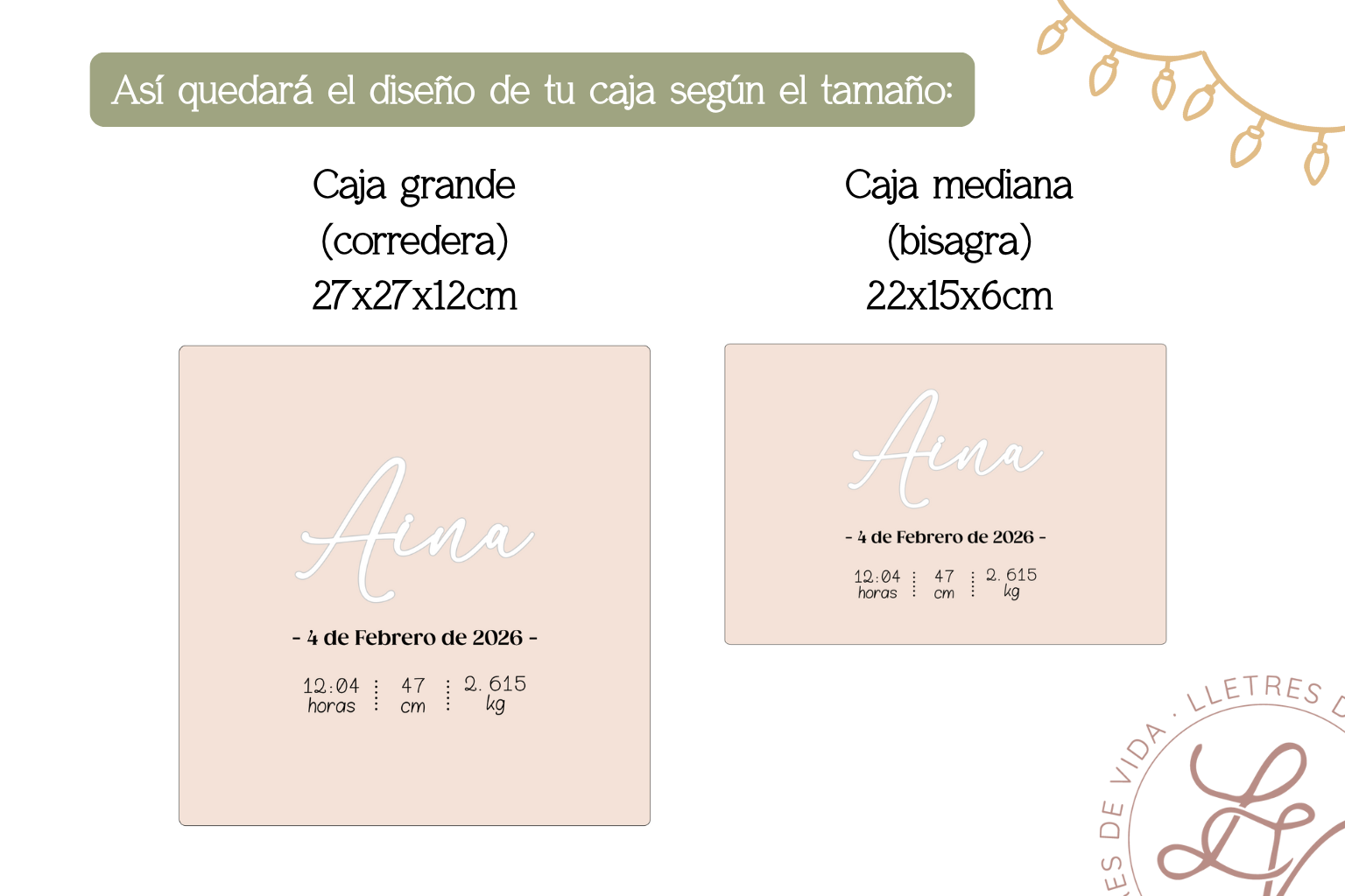Tienes dos medidas de caja para escoger (se adaptará el diseño a la medida de la caja):